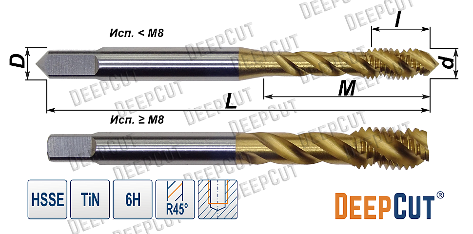 | M5x0,8 HSS-E 6H TiN SUS | 5 | 0.8 | 9 | 64 | 4.5 | 410 ₽ |
