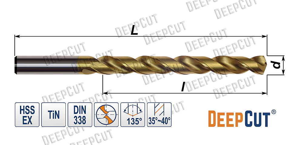 Спиральные шлифованные кобальтовые сверла HSS-EX SUS DIN338 TiN для сверления отверстий в заготовках из нержавеющих и жаропрочных сталей.